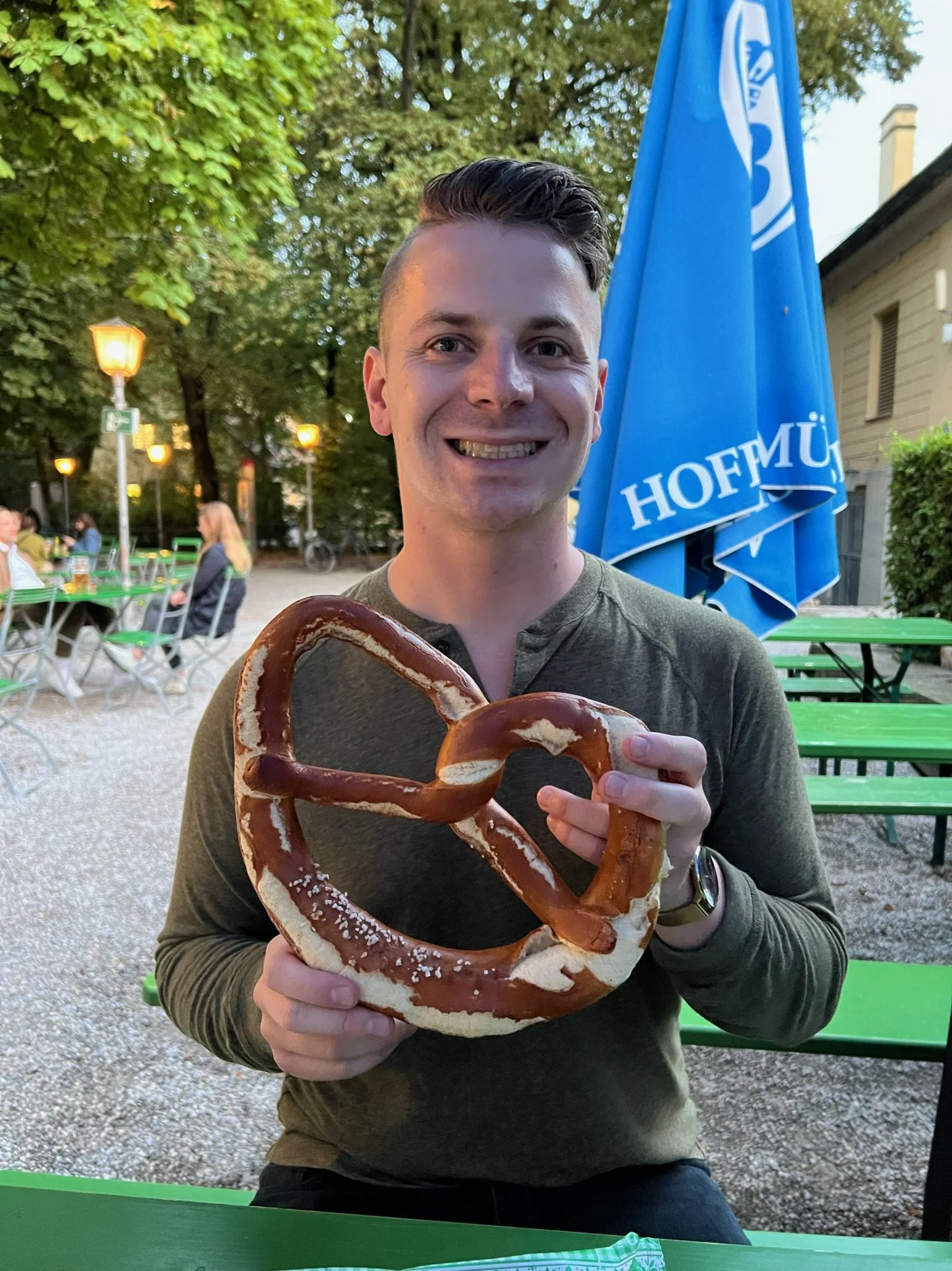 We decided to only tell a select few people about our engagement so that we could enjoy the rest of our Europe trip without our phones blowing up, which is why Wes had to post this picture later that day holding a giant pretzel in the weirdest way anyone has ever held a pretzel (to hide the ring):